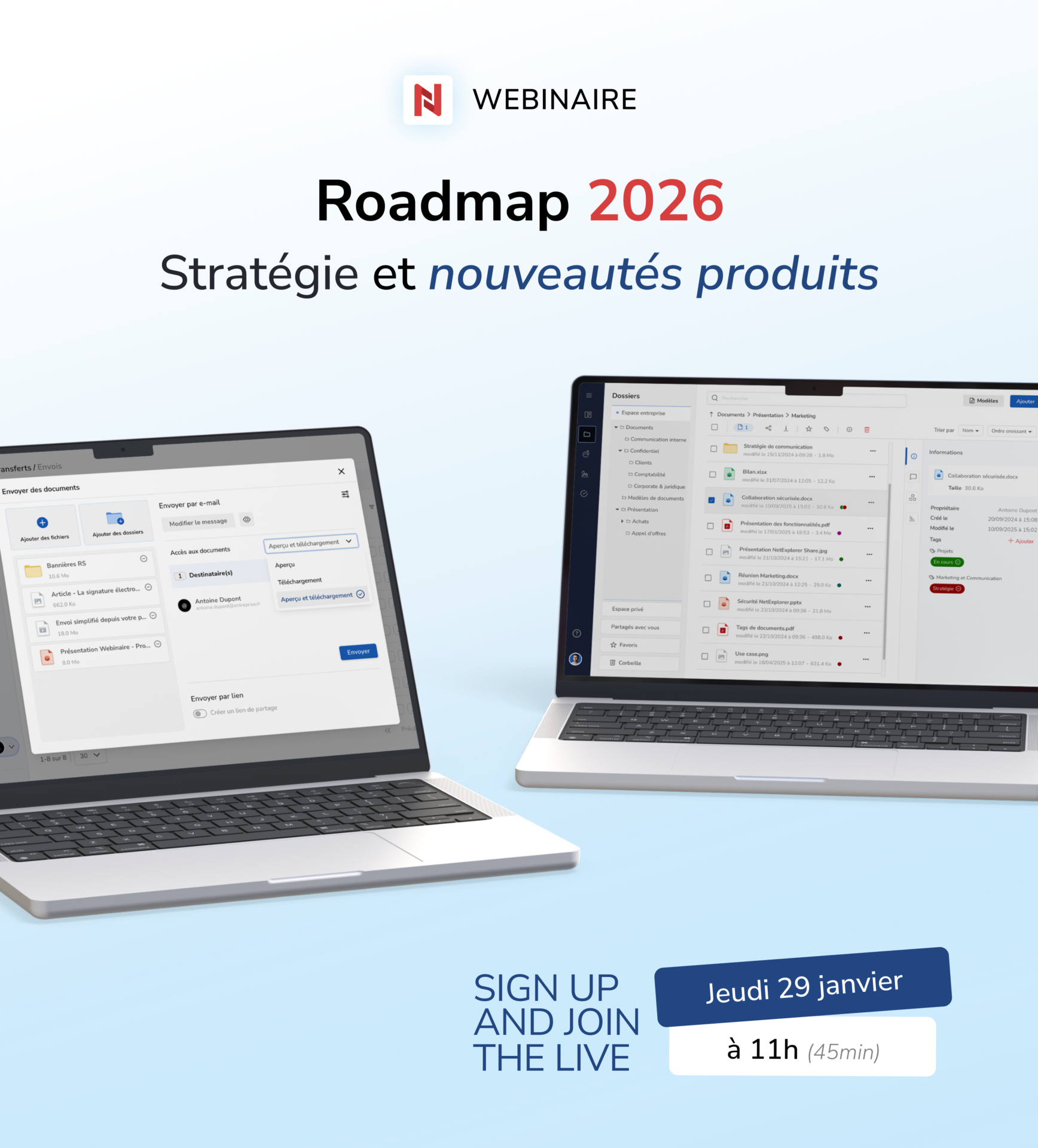 Que vous soyez client, futur utilisateur, ou simplement intéressé par les enjeux de la gestion sécurisée des fichiers, ce webinaire vous propose une présentation en avant-première de la roadmap NetExplorer 2026, avec un focus sur les projets majeurs à venir.